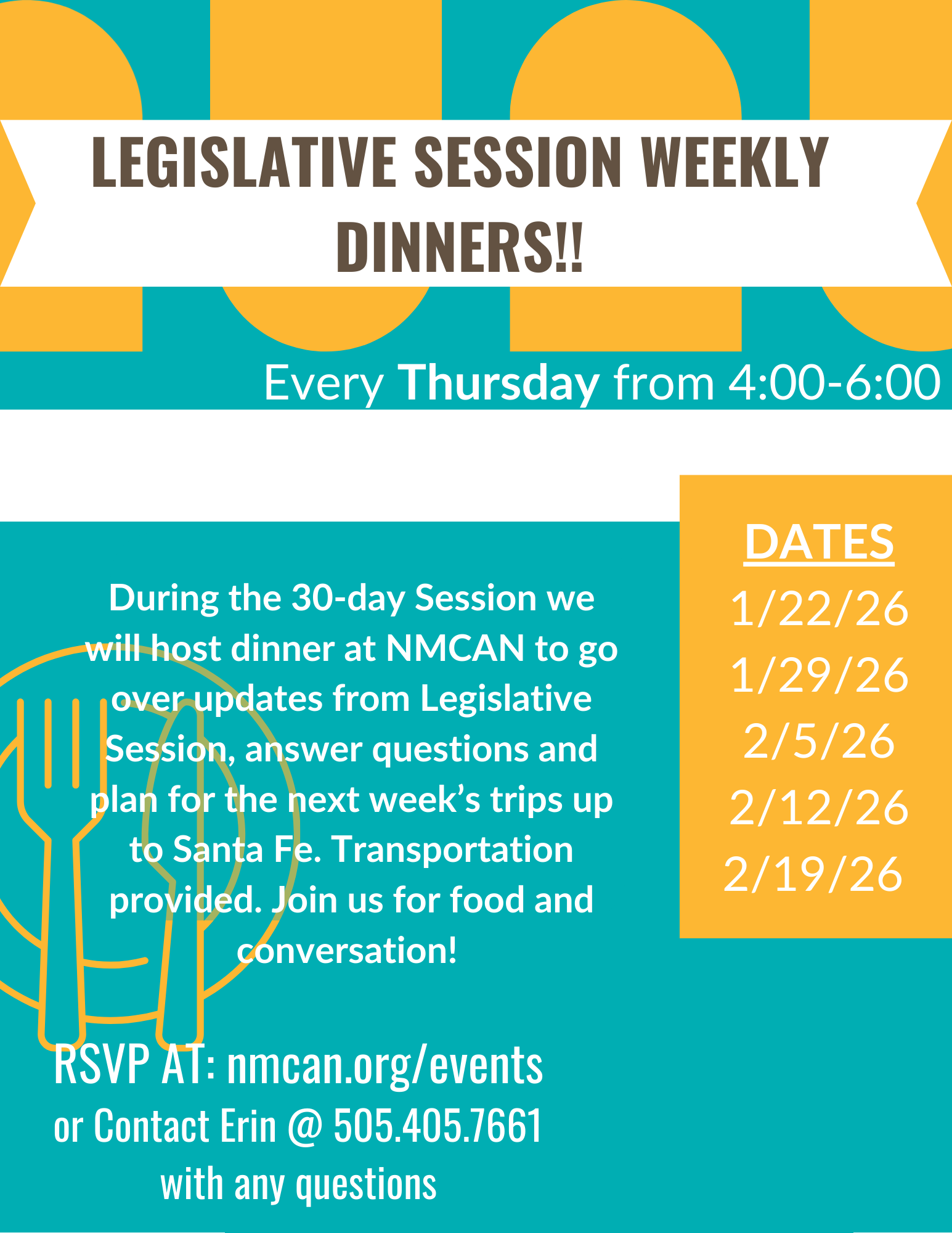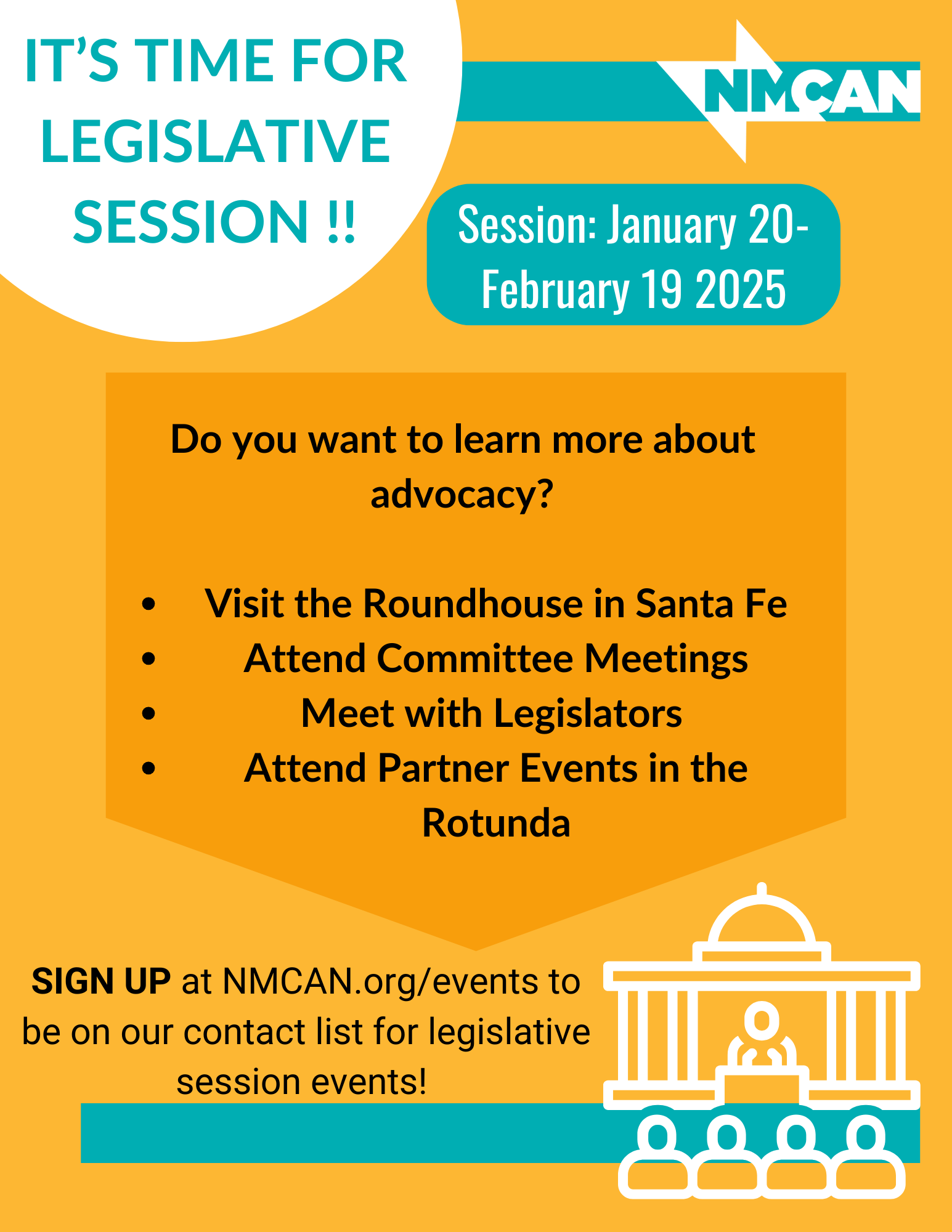 Sign up to be on our contact list at NMCAN.org/events, all legislative activities will be paid, and we will provide transportation and food.